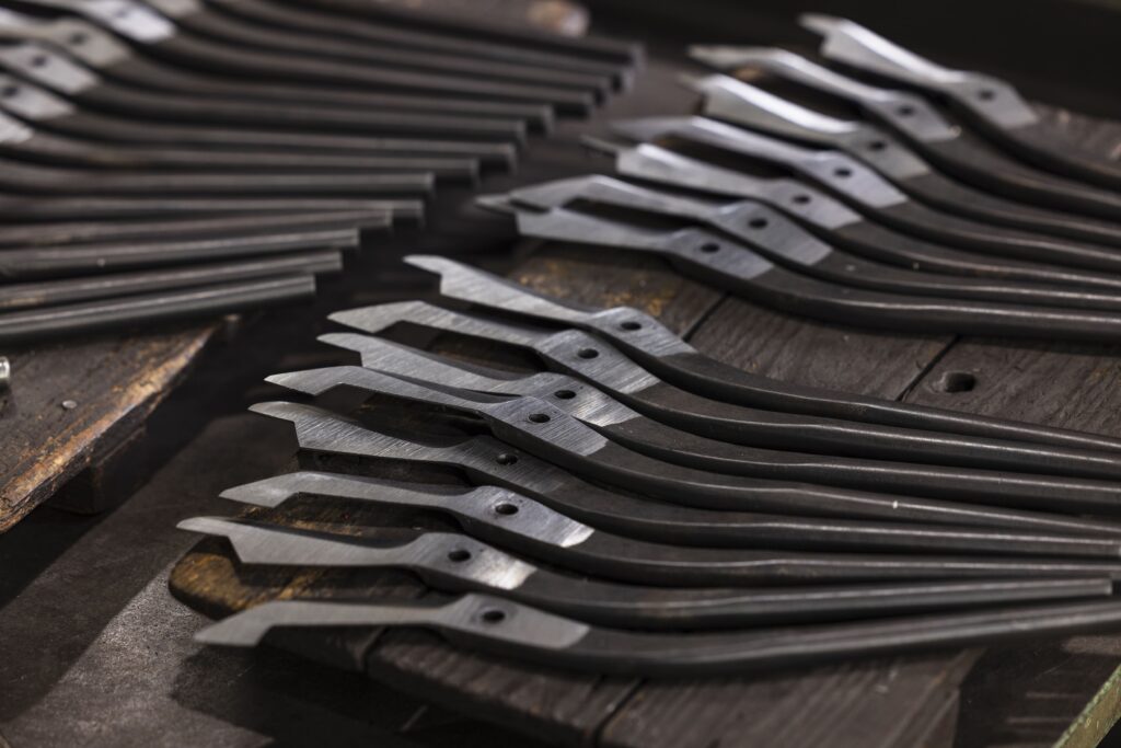 このような工具は金型を使って機械で製作するのが一般的ですが、当社の場合は鋼材を炉の中で熱し赤めてハンマーで叩く、いわゆるハンドメイドでの工具製作を特徴としています。